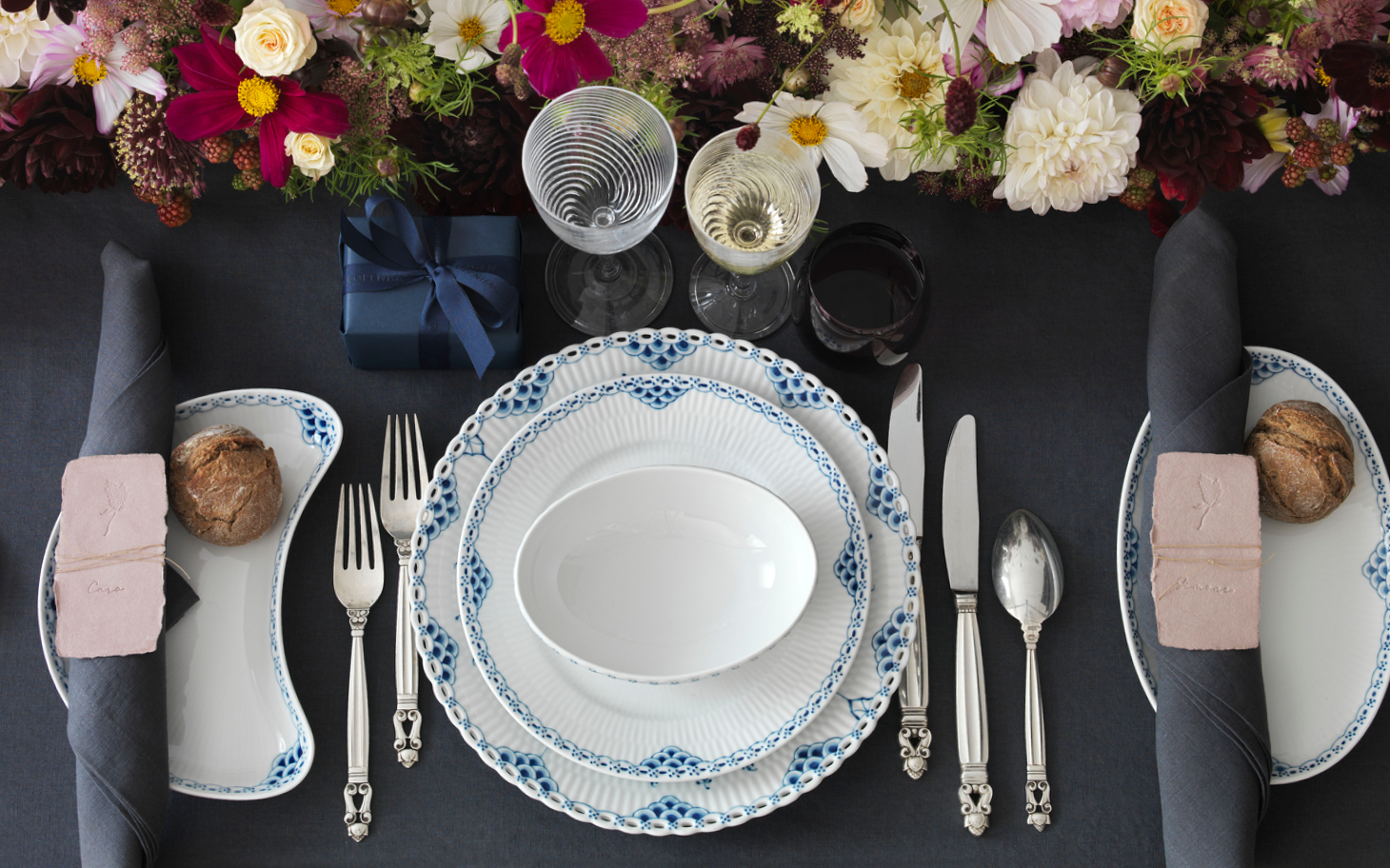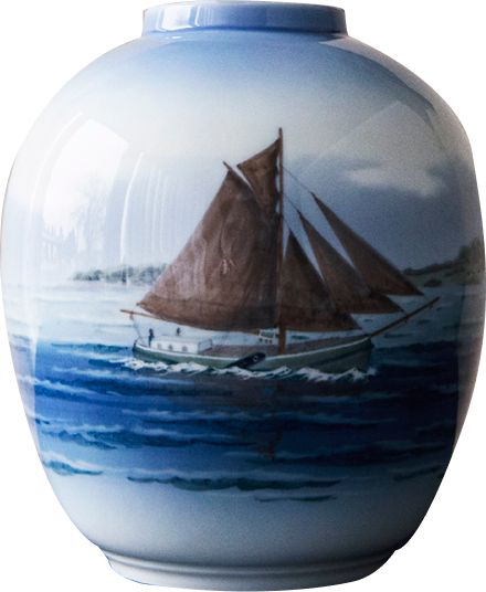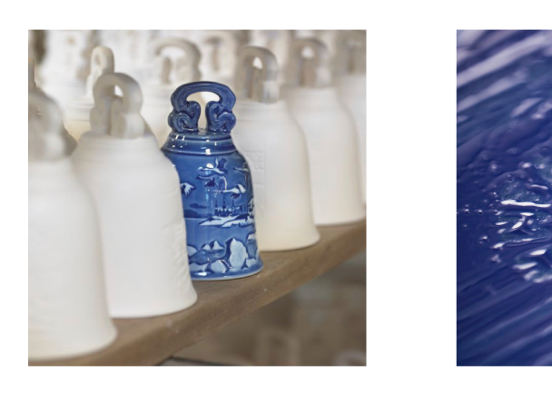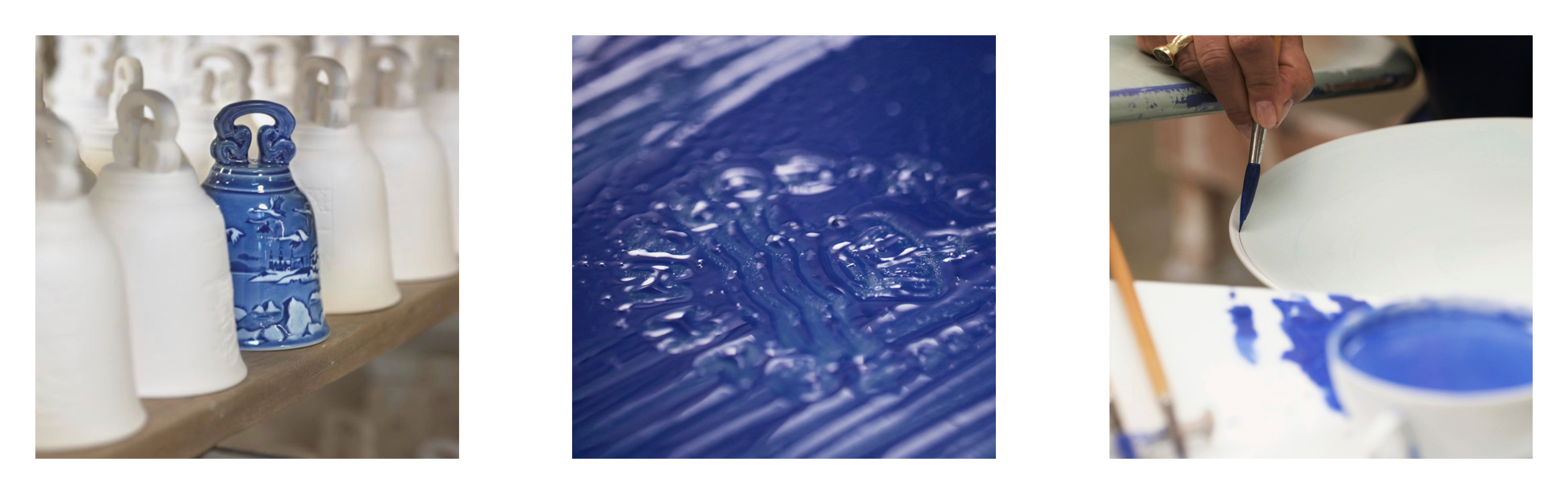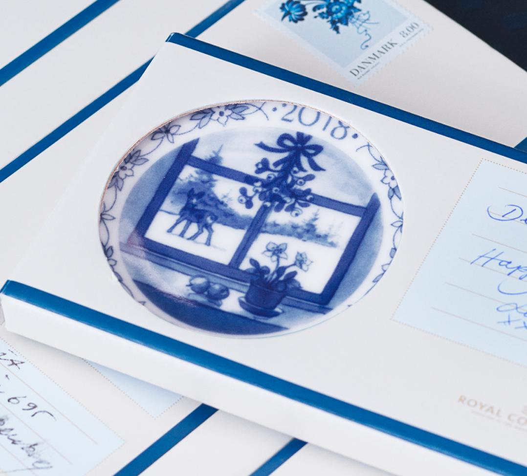 Синий цвет используется во многих изделиях Royal Copenhagen. Роспись фарфора - долгий и сложный процесс, который требует огромной точности и концентрации. Художник, использующий синий цвет, обучается своему ремеслу 4 года. Тонкий узор можно сравнить с личной подписью художника; на первый взгляд изделия могут показаться одинаковыми, но каждый мастер сразу же отличит свою работу и распознает творчество своих коллег. Кроме того, все художники ставят свою подпись на обратной стороне каждого расписанного изделия из фарфора. Линии личной подписи мастера сливаются в единый рисунок с тремя волнами Royal Copenhagen, которые символизируют три датских пролива: Орезунд, Большой Бельт и Малый Бельт.