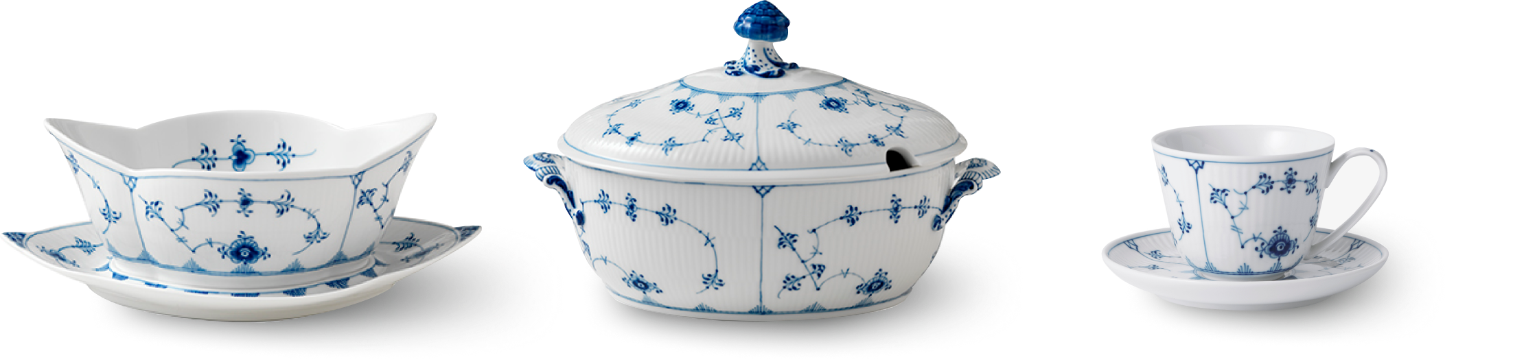 В Дании синий рифленый фарфор считается частью культурного наследия. Предметы из синего рифленого фарфора передаются из поколения в поколение, их можно найти во многих датских домах. За свою многовековую историю Royal Copenhagen произвел 1 500 - 2 000 различных видов чашек, кувшинов, мисок и тарелок, каждая из которых расписывалась вручную до мельчайших деталей. Встречались и более необычные изделия. В начале XVIII века коллекция Blue Fluted Plain была настолько популярна, что похожие узоры можно было встретить на всем, от умывальников до ночных горшков.