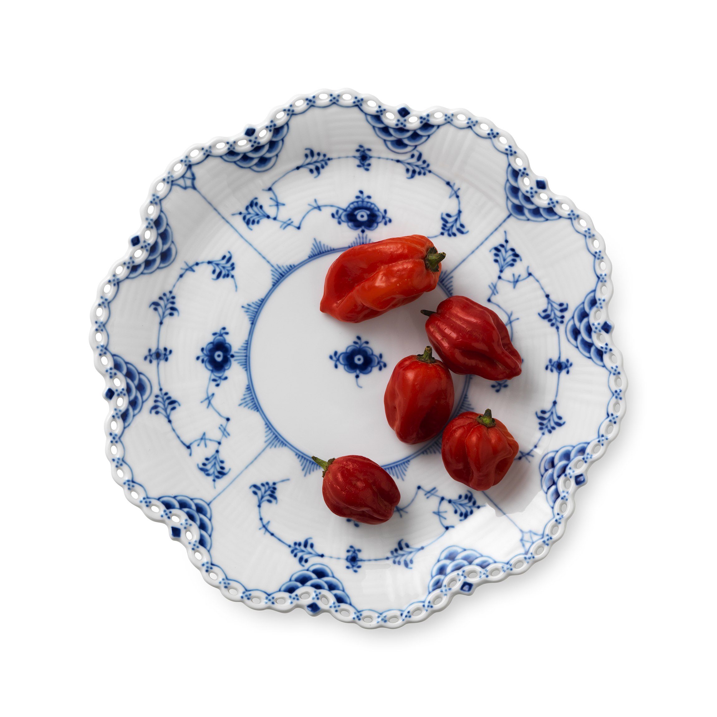 Столовый сервиз из старейшей «рифленой» серии королевского фарфора. Одна из самых первых коллекций мануфактуры, созданная в 1775 году, и спустя 110 лет модернизированная художественным руководителем Арнольдом Крогом. Принципиальные отличия коллекции Blue Fluted Full Lace:
