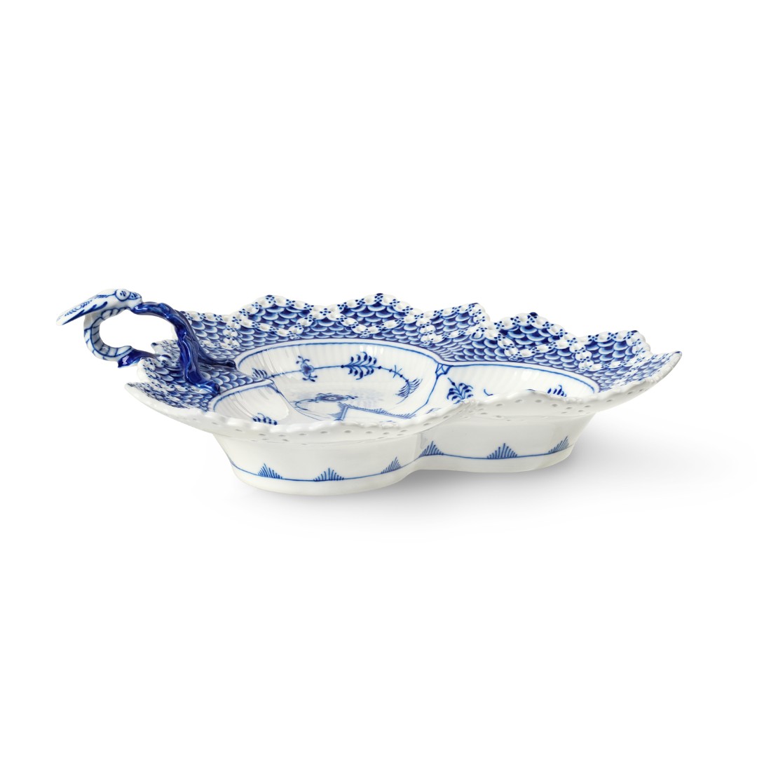 Столовый сервиз из старейшей «рифленой» серии королевского фарфора. Одна из самых первых коллекций мануфактуры, созданная в 1775 году, и спустя 110 лет модернизированная художественным руководителем Арнольдом Крогом. Принципиальные отличия коллекции Blue Fluted Full Lace: