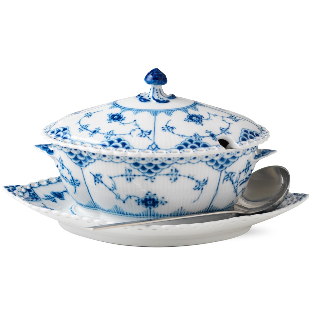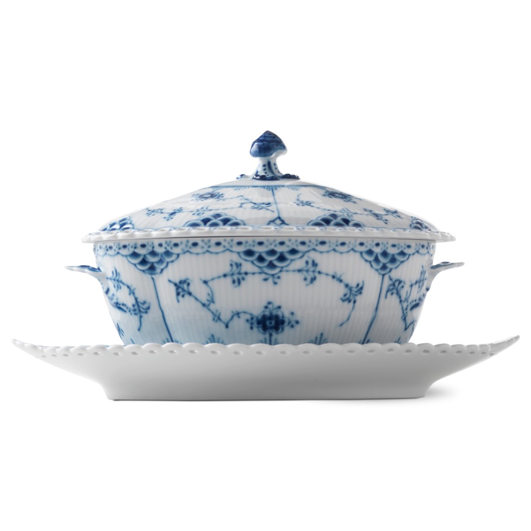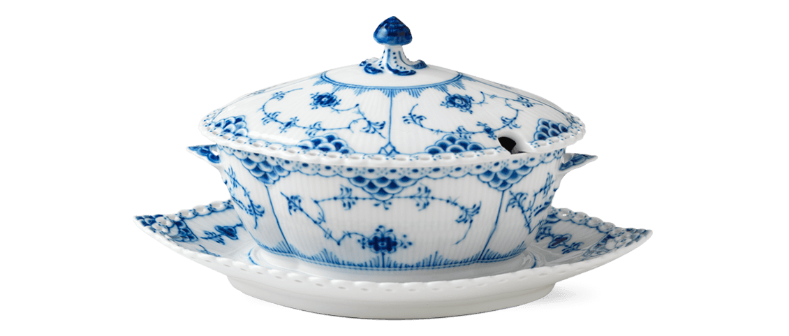 Столовый сервиз из старейшей «рифленой» серии королевского фарфора. Одна из самых первых коллекций мануфактуры, созданная в 1775 году, и спустя 110 лет модернизированная художественным руководителем Арнольдом Крогом. Принципиальные отличия коллекции Blue Fluted Full Lace: