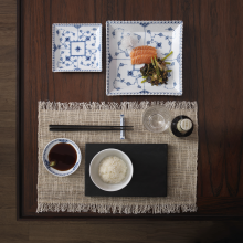 Коллекция состоит из предметов с разной геометрией: круглых, квадратных, овальных, тарелок. Блюд в виде полумесяца.