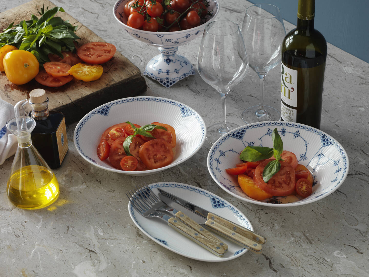 Одна из первых работ художника Арнольда Крога. Лаконичная и одна из самых нарядных «рифленых» серий, богато украшенная голубым орнаментом. Вышла в свет в 1888 году. Как и другие коллекции фарфора Royal Copenhagen конца 18 века, оформлена рисунком под названием «Узор номер 1», наложенным техникой ручной подглазурной росписи.