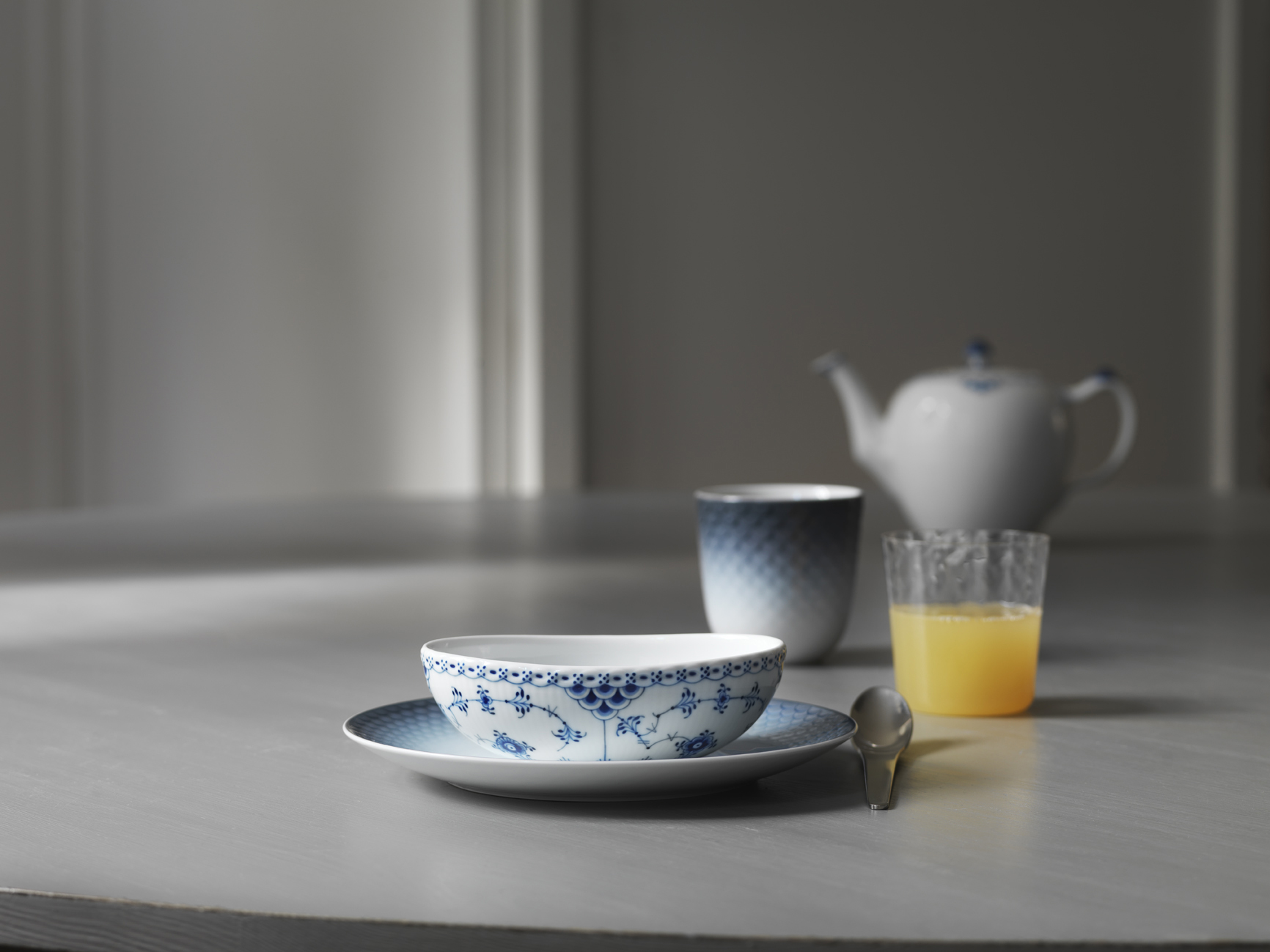 Одна из первых работ художника Арнольда Крога. Лаконичная и одна из самых нарядных «рифленых» серий, богато украшенная голубым орнаментом. Вышла в свет в 1888 году. Как и другие коллекции фарфора Royal Copenhagen конца 18 века, оформлена рисунком под названием «Узор номер 1», наложенным техникой ручной подглазурной росписи.