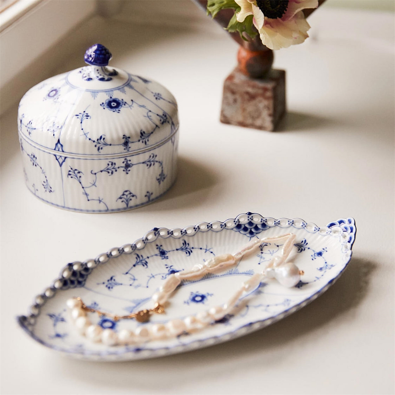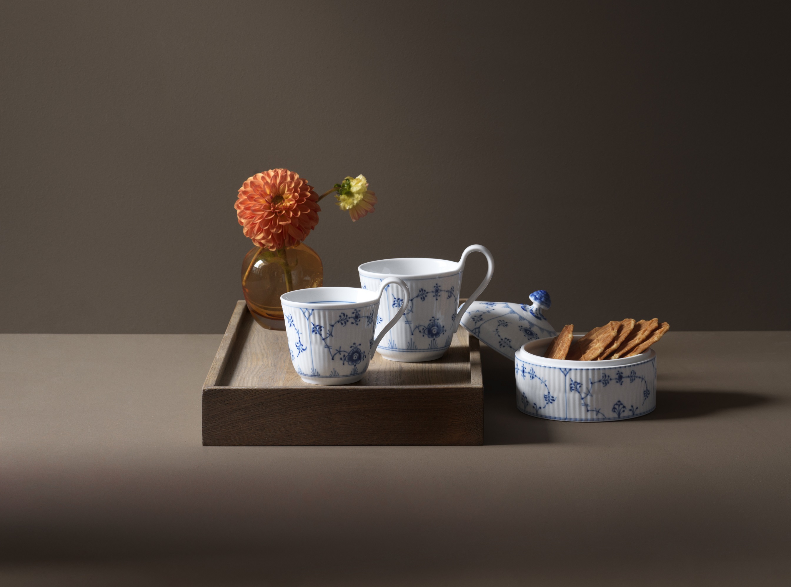 Одна из базовых коллекций датского фарфора, впоследствии многократно интерпретированная в других сериях. Создана в 1775 году, и в 1885-м переработанная архитектором и художественным руководителем Королевской мануфактуры, Анольдом Крогом.