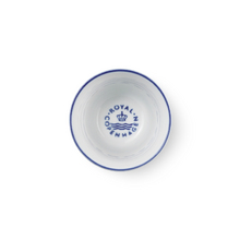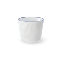 Дизайн кружки лишен ручки, что подчеркивает современный минималистичный силуэт. Белоснежный фарфор украшен деликатной синей линией, нанесенной вручную, и фирменным штампом-короной у основания. Это идеальный выбор для тех, кто ценит долгие неспешные завтраки.