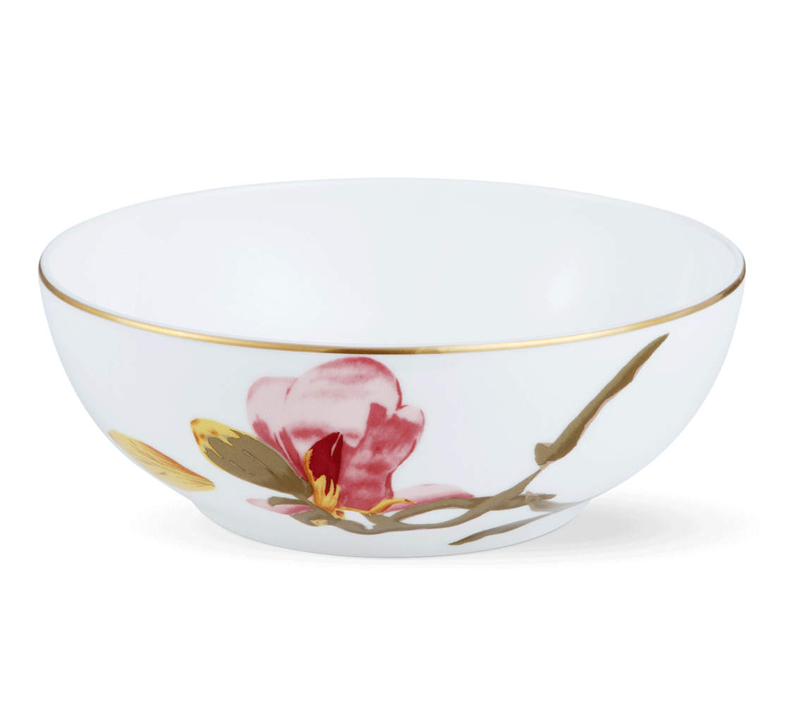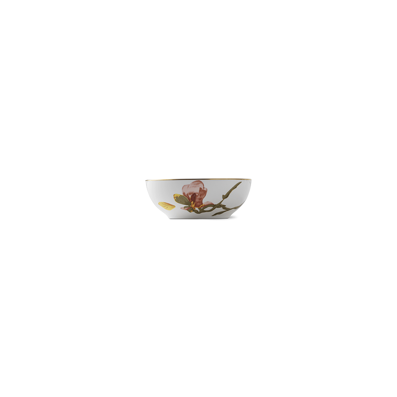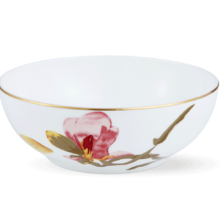 Изящная магнолия распускается в прекрасных красно-розовых оттенках на этой элегантной пиале Flora, украшенной тонким ободком с золотой окантовкой.