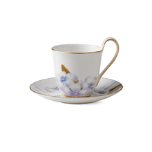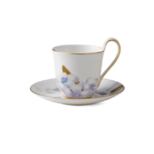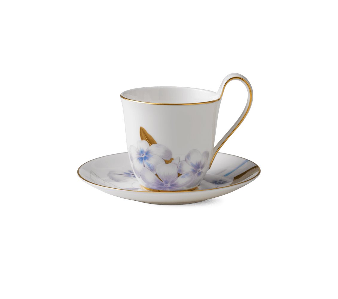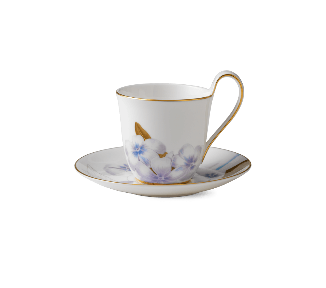 Изящная чашка с высокой ручкой и блюдцем из серии Flora декорирована цветами рододендрона, выполненными в деликатных, но ярких тонах, и утонченной золотой окантовкой. Отличительная особенность дизайна — плавный переход насыщенных оттенков цветов и листвы на блюдце в тонкий, едва заметный рисунок, напоминающий карандашный эскиз пышного соцветия. Универсальный объем чашки делает её идеальной для подачи как чая, так и кофе.
