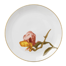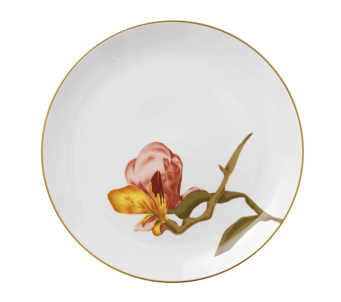 Изысканная магнолия распускается нежными лепестками на тарелке Flora c мотивом цветка магнолии. Оттенки розового и оранжевого в цветке дополняются прекрасным золотым ободком, придавая этой романтичной тарелке утонченный вид.