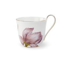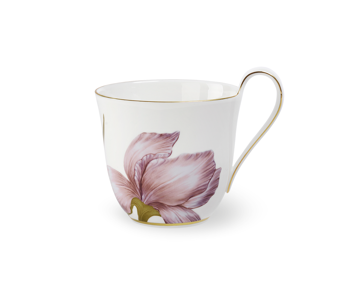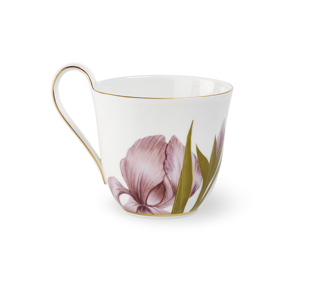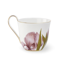 На этой чашке Flora нежные лепестки ириса распускаются в мягких пурпурных тонах, дополненных изящными золотыми листьями. Чашка большего объема, чем классические чайные пары с блюдцами, также украшена тонкими золотыми деталями по ободку и на ручке, придавая ей особую элегантность.