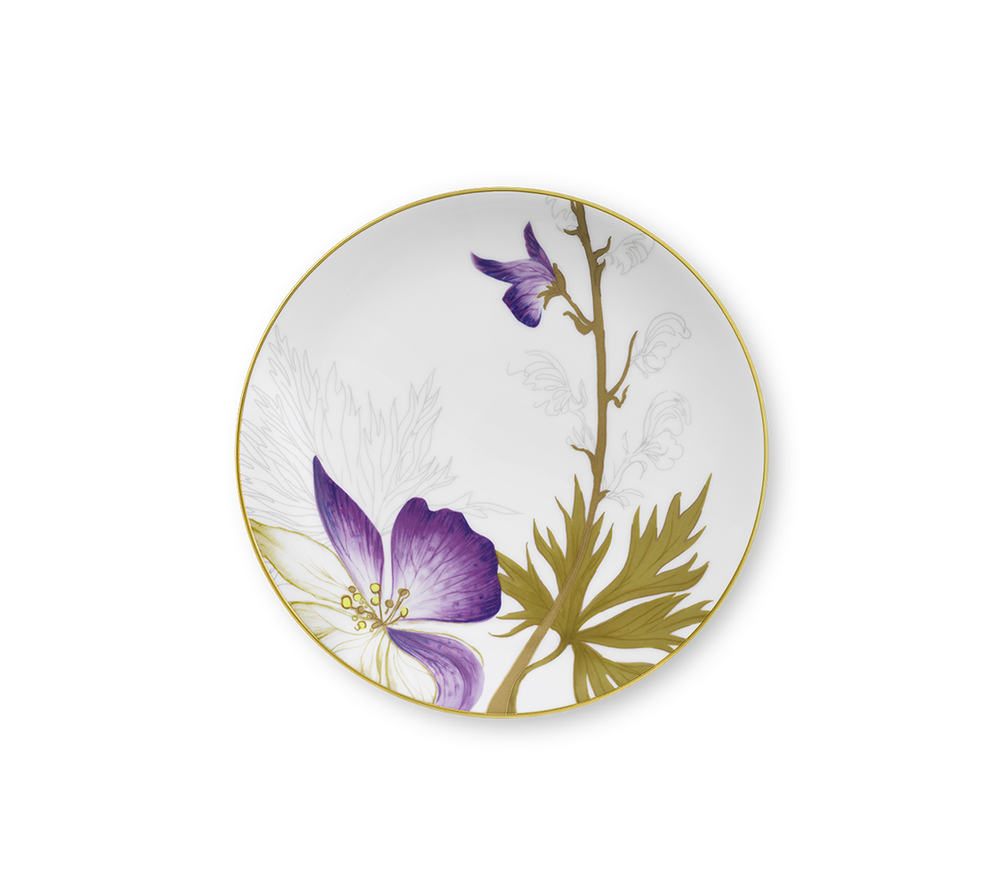 Изящная тарелка из коллекции Flora украшена восхитительным темно-фиолетовым цветком Анютины глазки, представленным в трех различных стадиях цветения. Благодаря своему элегантному дизайну, тарелка диаметром идеально подходит как для сервировки обеда, так и для десерта, а также легко сочетается с другими тарелками из серии Flora, позволяя создать вашу собственную уникальную сервировку.