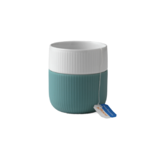 Использована необычная техника декора. В частности, все предметы коллекции имеют одинаковую форму, но не повторяются в цветах, по традиции имеют рифленую поверхность и разделены на две половинки – белую верхнюю и цветную нижнюю, сделанную из силикона.