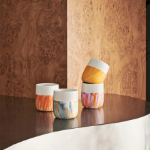 Использована необычная техника декора. В частности, все предметы коллекции имеют одинаковую форму, но не повторяются в цветах, по традиции имеют рифленую поверхность и разделены на две половинки – белую верхнюю и цветную нижнюю, сделанную из силикона.