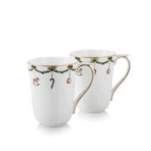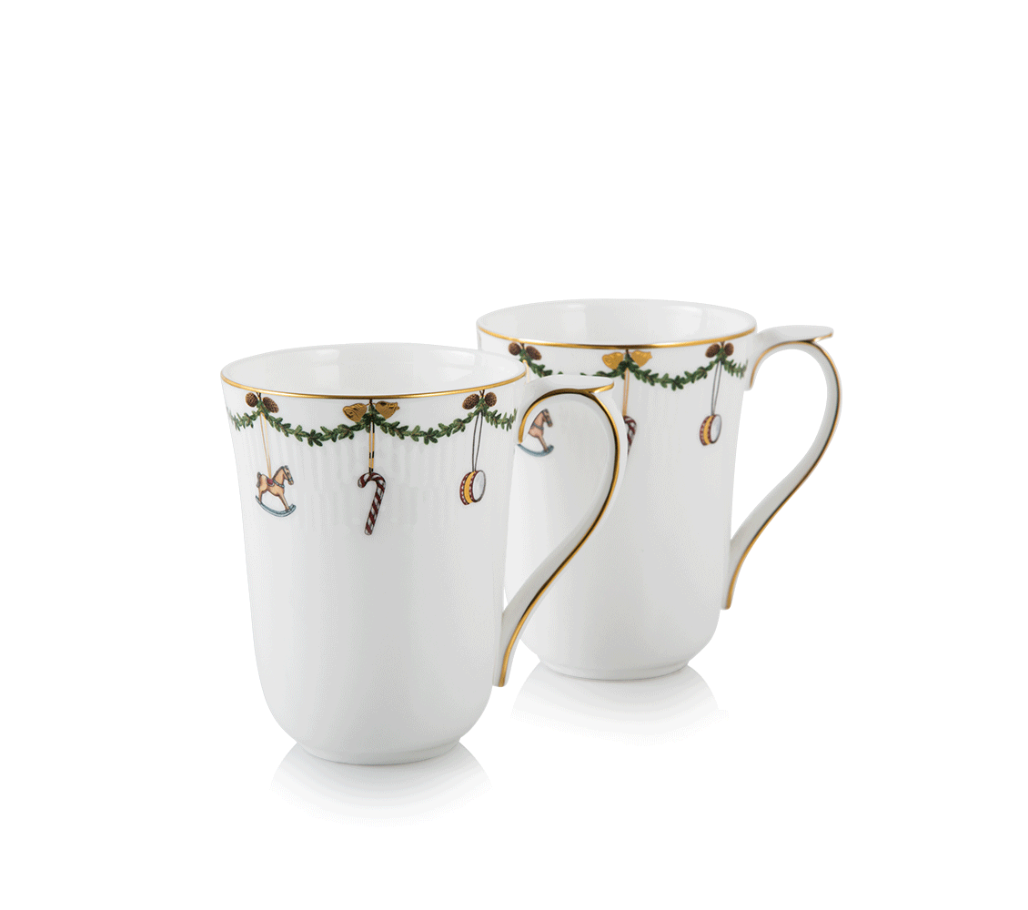 Набор Star Fluted Christmas от Royal Copenhagen — это элегантный и самодостаточный подарок, который принесет праздничное настроение в любой дом. В комплект входят две чашки, выполненные из тончайшего костяного фарфора. Они украшены традиционными еловыми гирляндами, рождественскими игрушками и изысканными золотыми деталями. Этот узор навевает тёплые воспоминания о датских рождественских традициях. Благодаря объему 360 мл чашки идеально подойдут для чаепития или кофе-брейка.