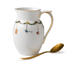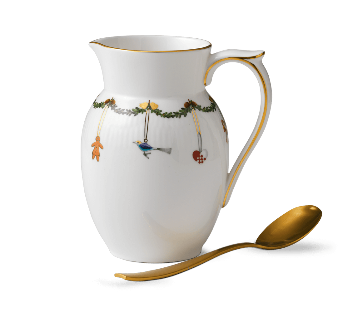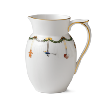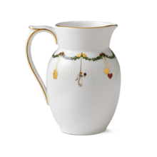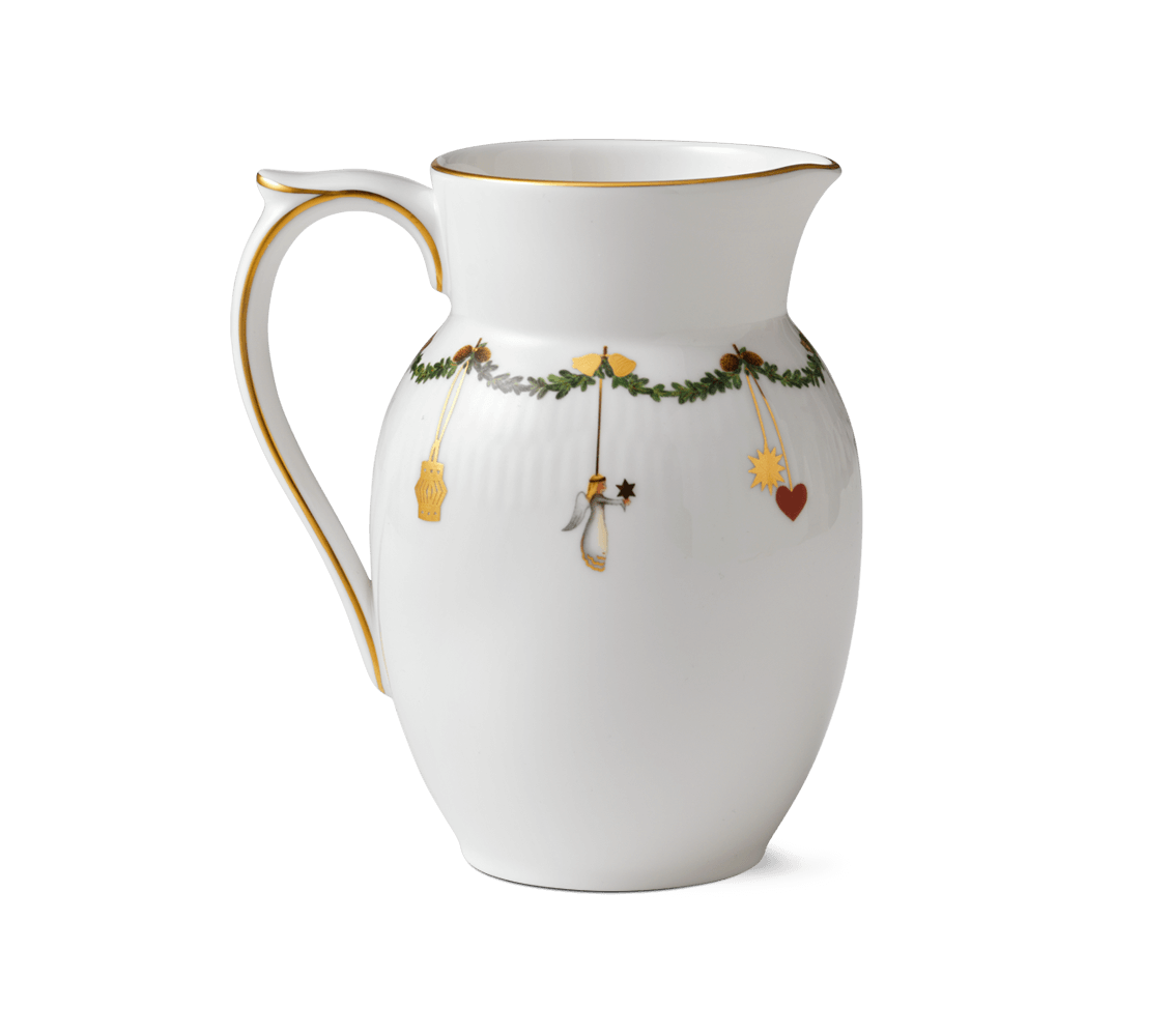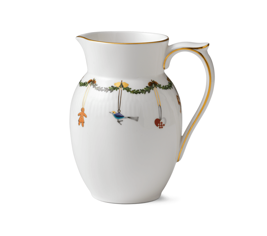 Привнесите праздничное изящество с кувшином Royal Copenhagen Star Fluted Christmas объемом 900 мл. Этот великолепный кувшин из высококачественного костяного фарфора украшен элегантным венком из еловых веток с шишками и рождественскими орнаментами. Золотая окантовка придает ему особую торжественность.