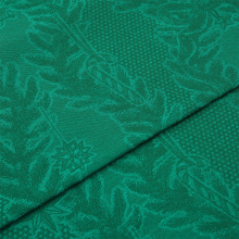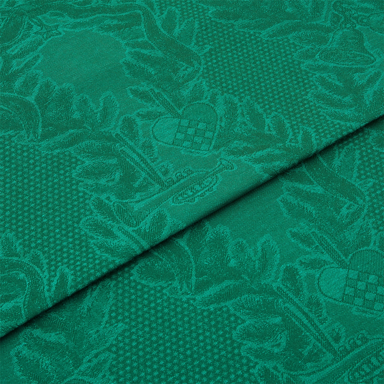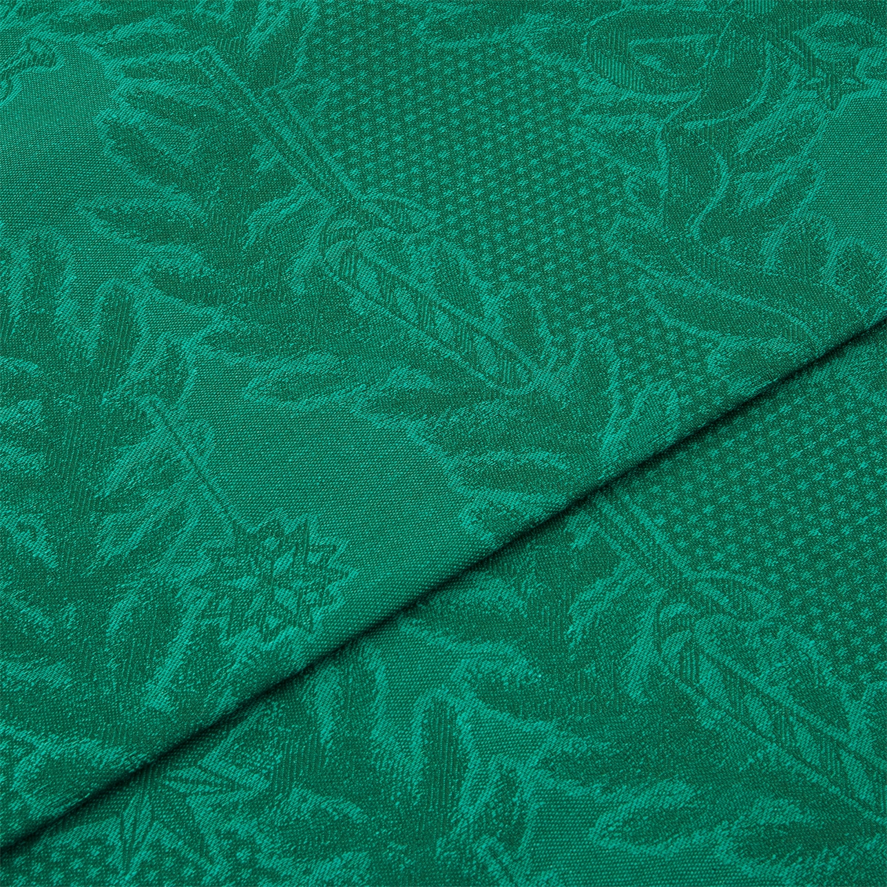 Выполненная из смеси хлопка и льна, скатерть имеет жаккардовый узор, сотканный в зелёном цвете, который передаёт атмосферу праздничного сезона.