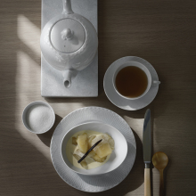 Белоснежный фарфор с рифленой структурой – это признак фирменного стиля, повторяющийся во всех коллекциях серии «Fluted». От коллекции White Fluted, сервиз Half Lace отличается изысканным кантом. Нежное ажурное кружево проходит тонкой линией вдоль среза посуды, украшая края чашек, тарелок и других предметов. На поверхностях отсутствует какая-либо роспись.