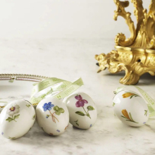Данная коллекция - это изделия из тонкого фарфора, выполненные в виде подвесок, которые можно повесить на ветки, люстру или пасхальное дерево. Яйца украшены нежной росписью с мотивами цветов и птиц. Это прекрасный весенний сувенир, который можно купить в подарок или для собственной коллекции.