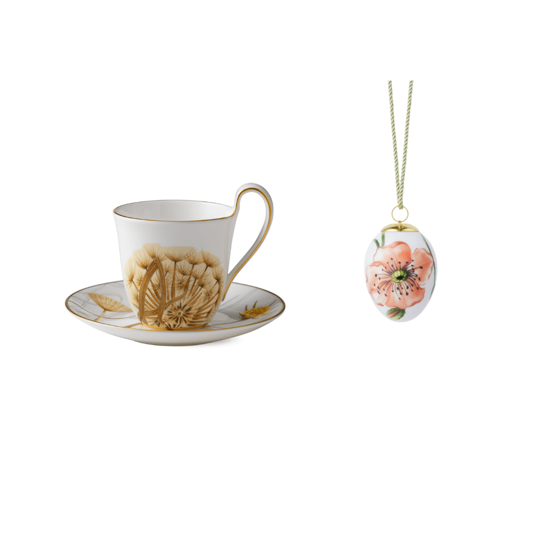 Подарочный набор из пасхального яйца с мотивом крупного узора цветка мака и чашки с блюдцем с мотивом одуванчика из коллекции Flora.