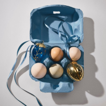Изысканное пасхальное яйцо из стали, покрытое 18-каратным золотом, подвешено на нежной атласной ленте.