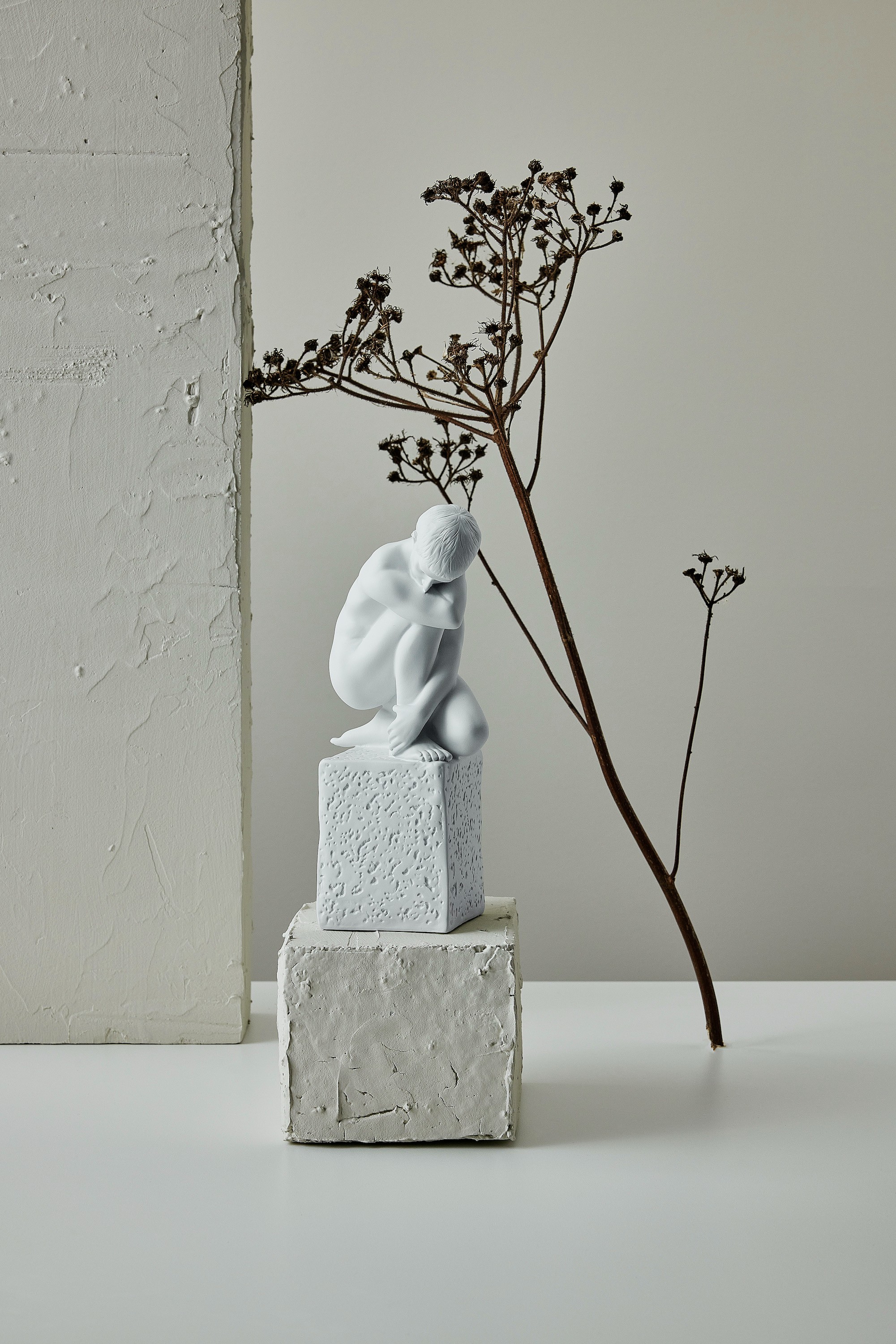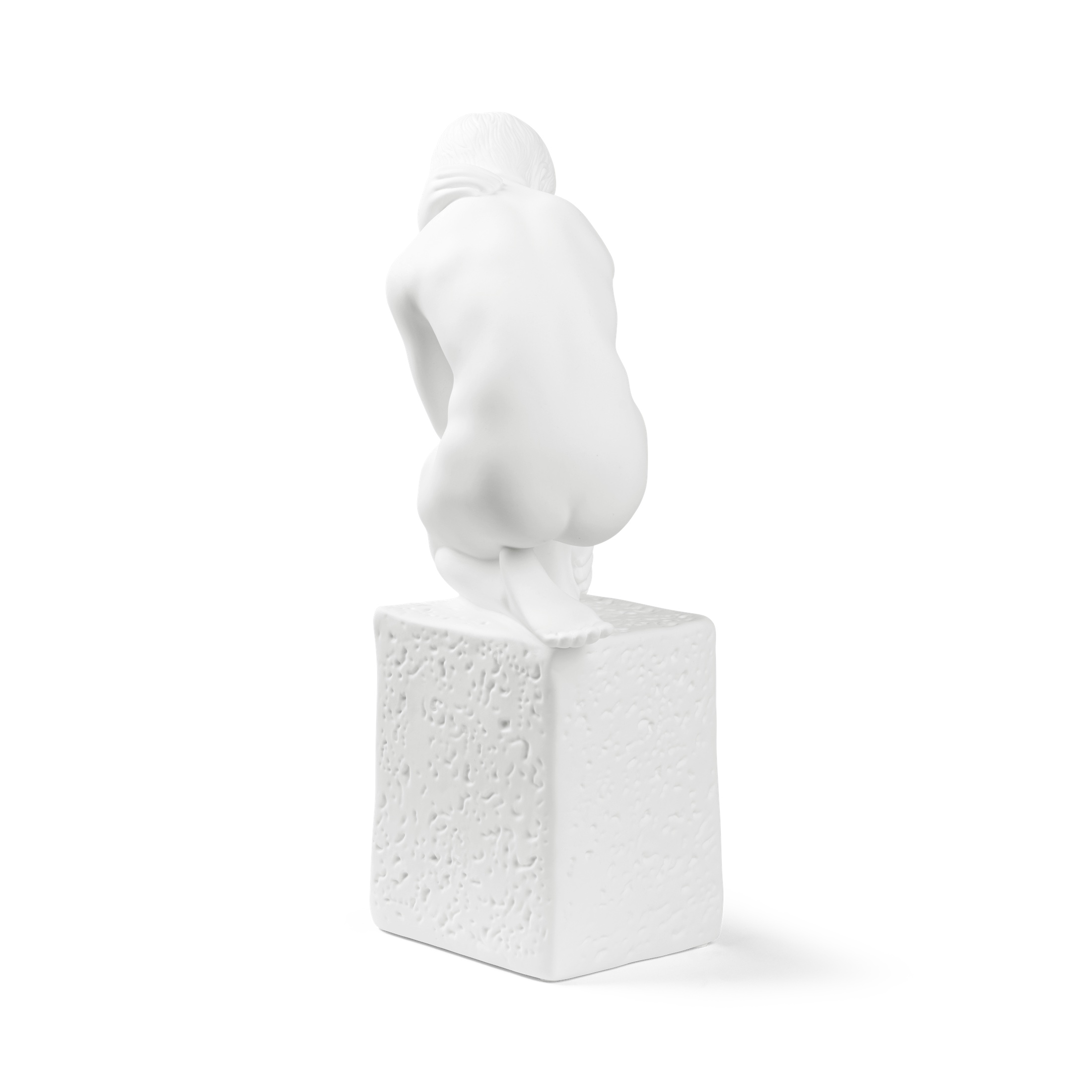 Фигурка создана из бисквитного фарфора. Отказ от глазури в пользу матовой текстуры превращает объект в «живую» скульптуру: свет мягко рассеивается по поверхности, подчеркивая каждый изгиб. Это делает статуэтку не просто декором, а тактильным и визуальным удовольствием.
